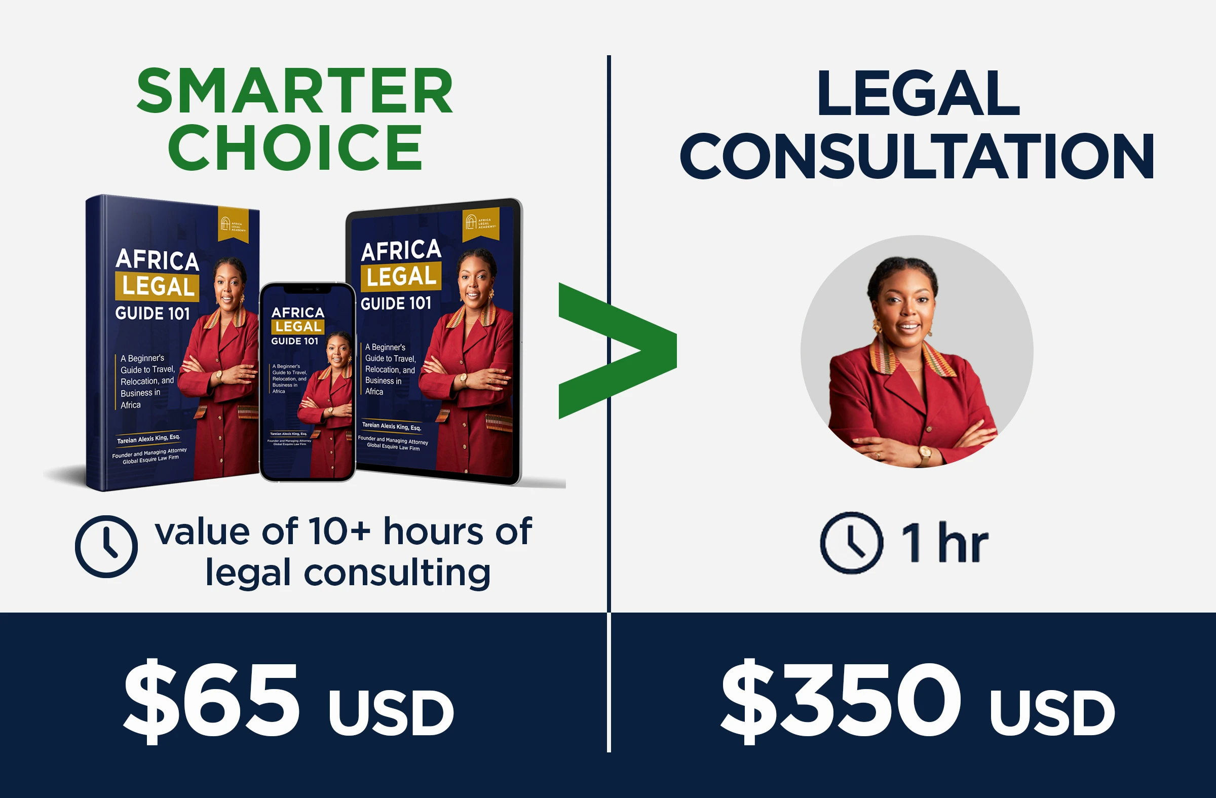 Covering everything inside Africa Legal 101 would take more than ten hours of consultations at our standard rate of $350 per hour — a value of over $3,500 in attorney time. With this book, you receive that same foundational guidance for just $65, giving you reliable answers upfront before you invest in legal services.